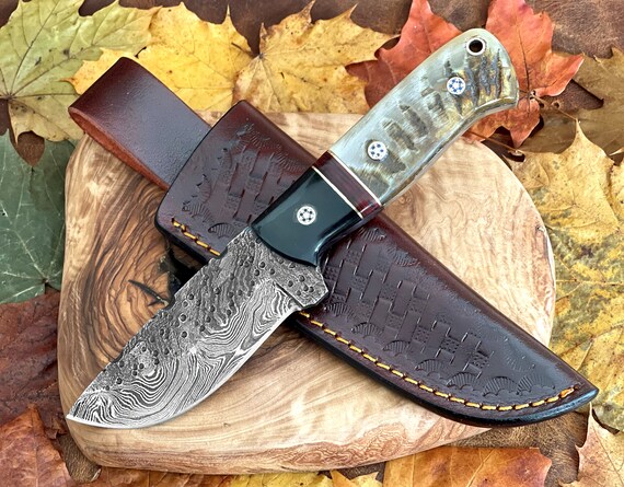 Amazon Com Whole Earth Supply Raindrop Damascus Tracker Knife Hunting Knives Blue Wood Handle Sheath Sports Outdoors